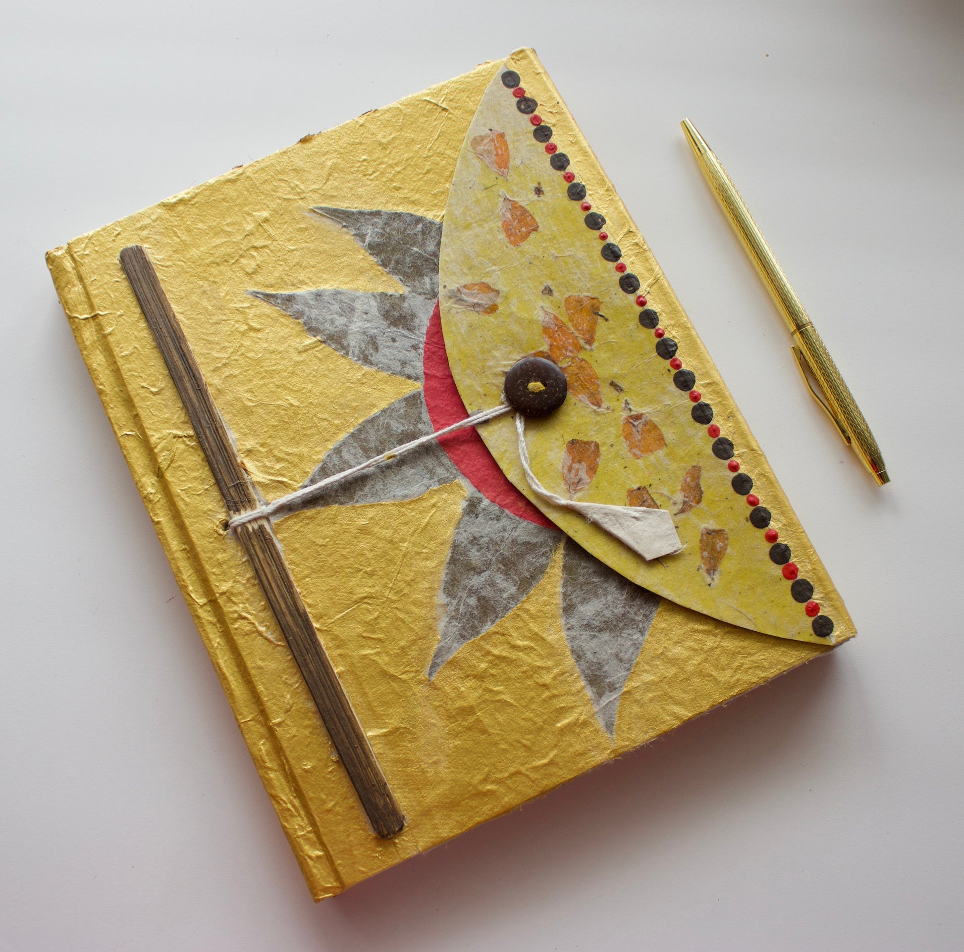 Bask in the warmth of inspiration with our Golden Sunshine Journal. Each page is a canvas for your thoughts adorned with the splendor of golden rays, delicately painted in luxurious acrylic. This handmade journal isn't just a repository for your ideas; it's an embodiment of radiance and creativity. Feel the golden hues ignite your imagination as you pen down your brightest dreams and ideas. Let the luminous touch of gold awaken your inner brilliance on every page.